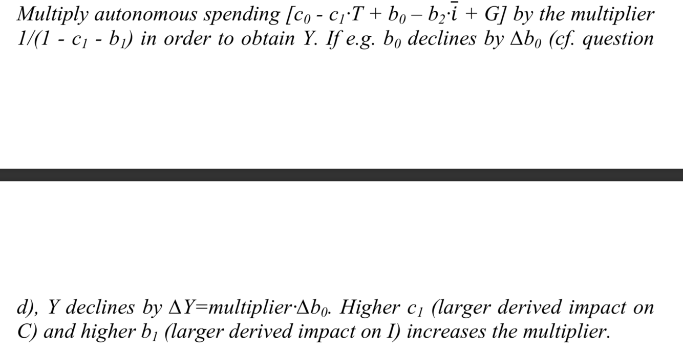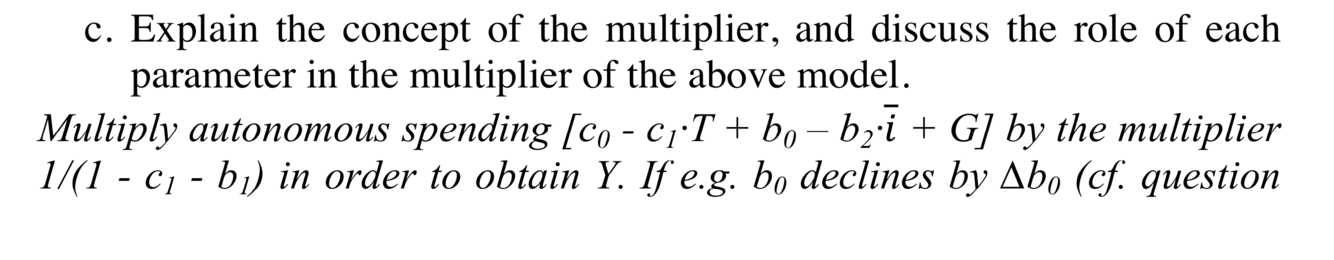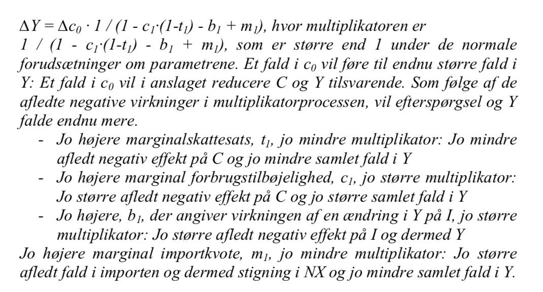 c. Udled virkningen på output af faldet i c0. Forklar i den forbindelse begrebet multiplikator og den betydning, som hver enkelt parameter har for multiplikatoren.
