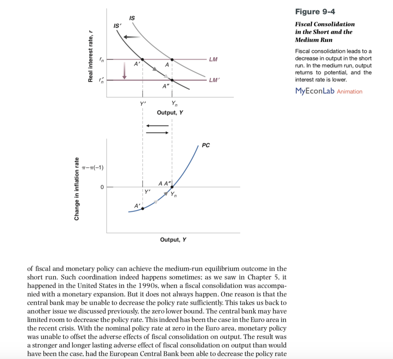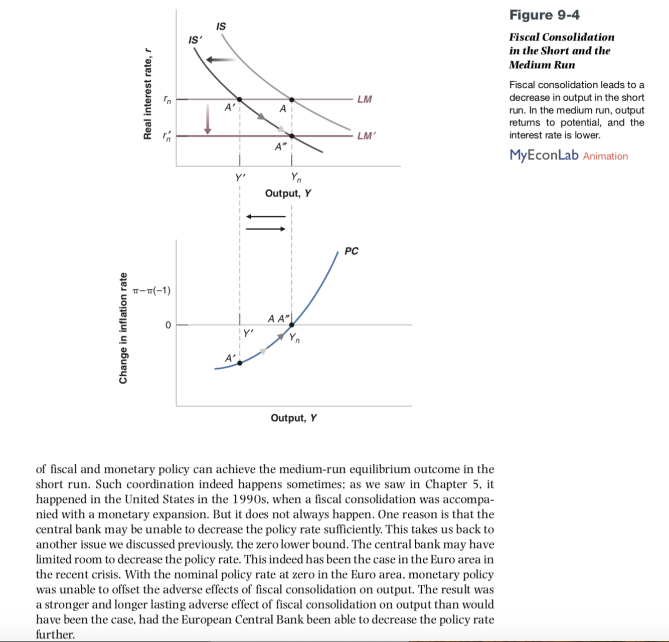 See Blanchard, Figure 9-4 (CB attempts to obtain a movement from A’ to A’’): Output gradually rises to potential output and inflation declines further, but slower while there is still a negative output gap.