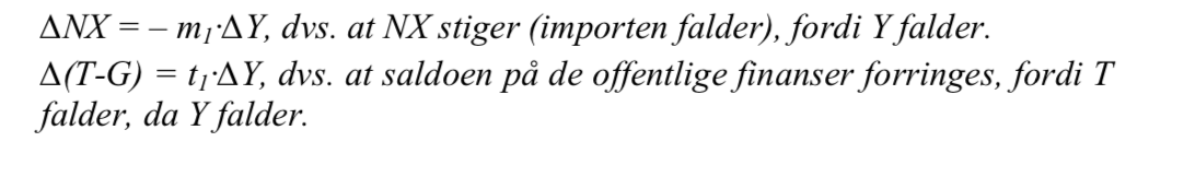 Diskretionær finanspolitik er eksogene ændringer i G og/eller t1. Automatisk stabilisering er endogene ændringer i T, som reducerer udsvingene i Y (t1 mindsker multiplikatoren), jf. spm. c. Et underskud på de offentlige finanser kan skyldes endogent lav T (fremkaldt af recession, jf. spm. d) og kan derfor ikke nødvendigvis tages som udtryk for ekspansiv diskretionær finanspolitik.