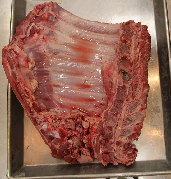 Caecum åbnes fra ileum til apex caeci, colon ascendens klippes op mellem krøset og tænien, og snittet føres videre gennem colon transversum og colon descendens langs krøstilhæftningen