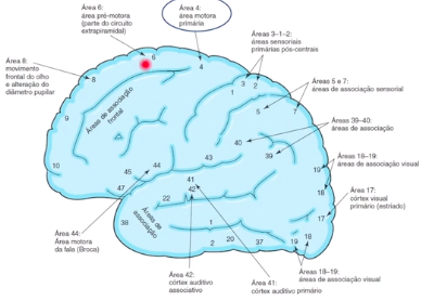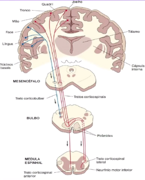 A partir da área 4 sai o trato corticoespinhal em vermelho, que sai do núcleo da base e no _ faz a decusação das pirâmides