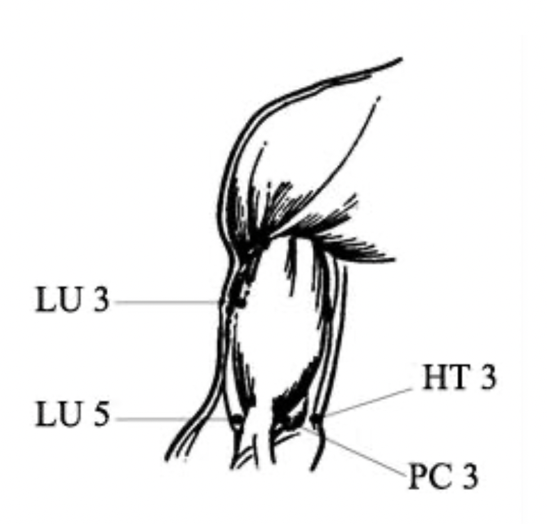 2 cun distal to LI 11 on the line connecting LI 11 and LI 5 in the depression between brachioradialis and extensor carpi radialis longus