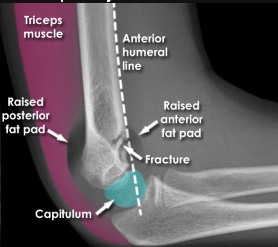 Hx: FOOSH, elbow pain, lack of mobility, tenderness on palpation of posterior aspect of elbow. Inability to extend elbow. Check NVS