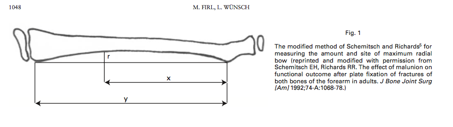Radial bow: 10 degrees (in coronal plane), concave medially (towards ulna)