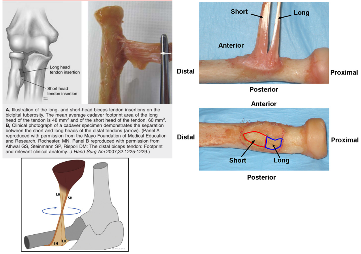 Describe the distal biceps tendon anatomy and insertion