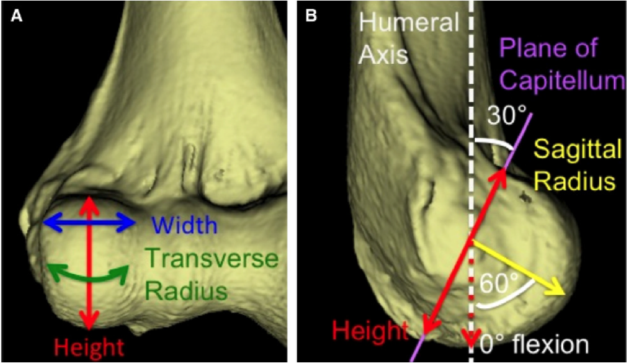 30 degrees anteriorly tilted (flexed) in sagital plane)-The humerus shows a 30 degrees anterior rotation of the articular condyles with respect to the long axis on the humerus
