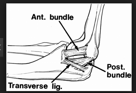 Anterior bundle - most important. Primary stabilizer to valgus stress at 20-120 degrees