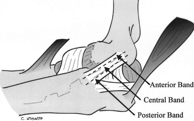 Central band - most important, isometric bundle. Can maintain normal elbow kinematics and stability throughout the arc of flexion