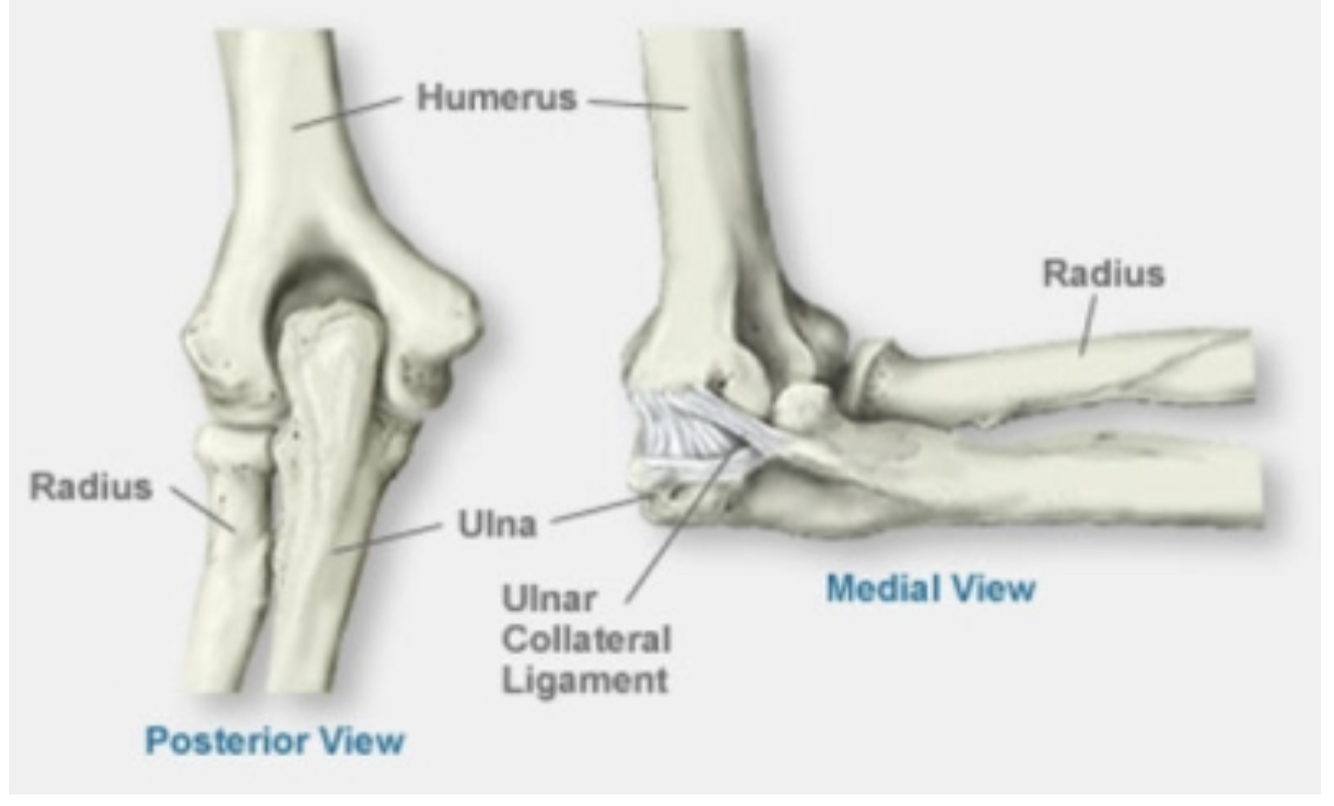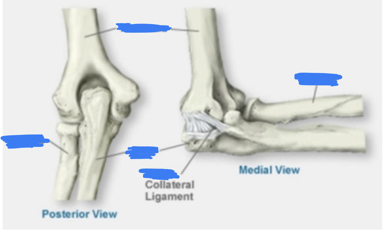 Ulna is bigger proximally, radius is bigger distally. Radius rotates, ulna doesn’t. The bones are held togeher by two radio-ulnar joints, proximally and distally.