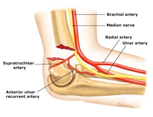 Which nerve and artery can be damaged in a supracondylar fracture?
