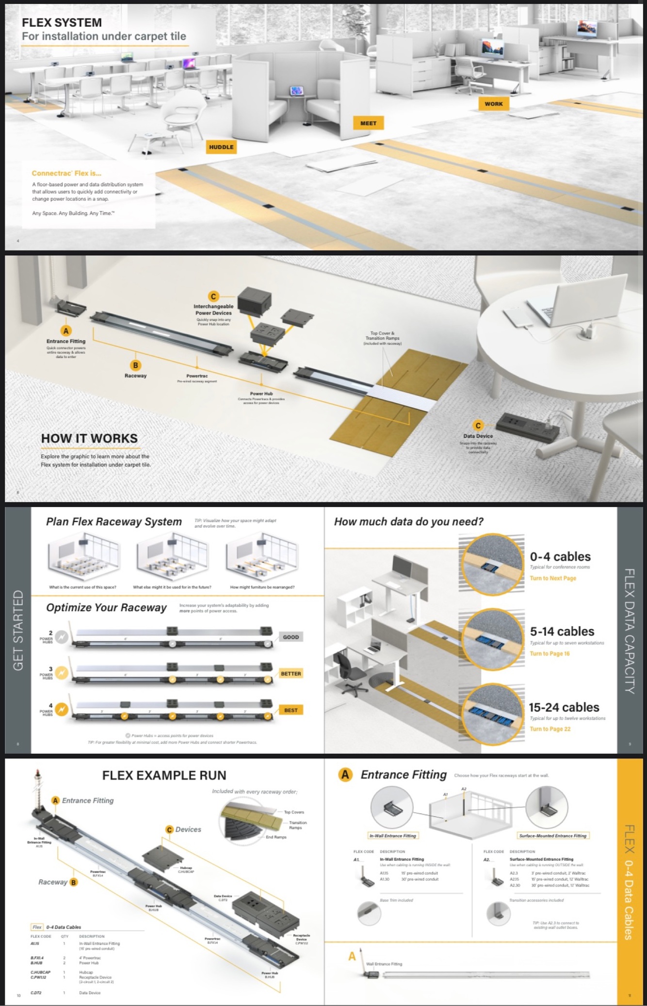 Connectrac Flex is a floor-based power and data distribution system that allows users to quickly add connectivity or change power locations in a snap. Flex features a low-profile raceway that is available with two installation options – under carpet tile and on top of any flooring surface.