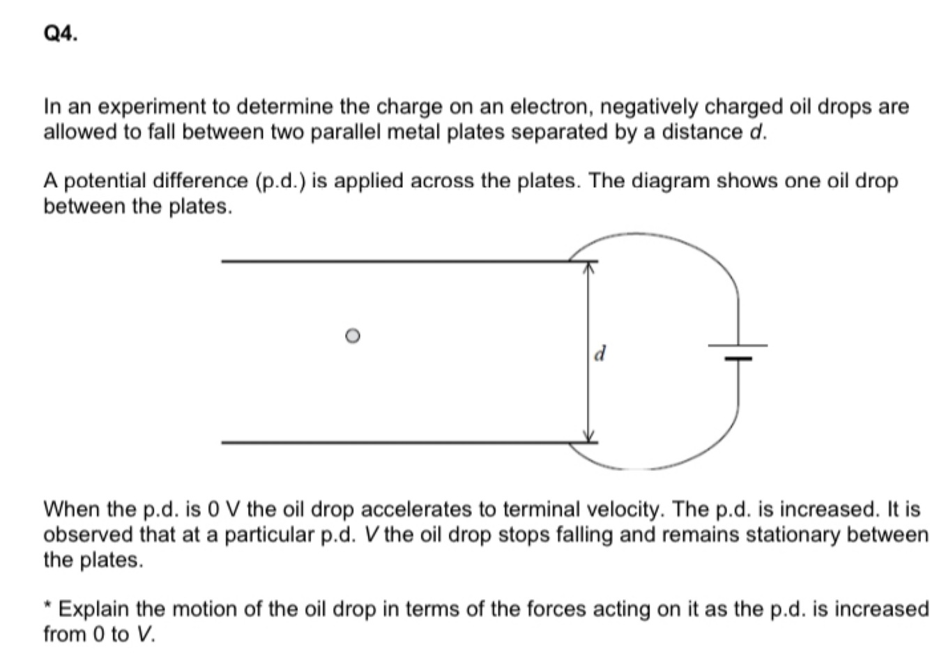7) Drop remains stationary when Weight = electrostatic force from positive plate.