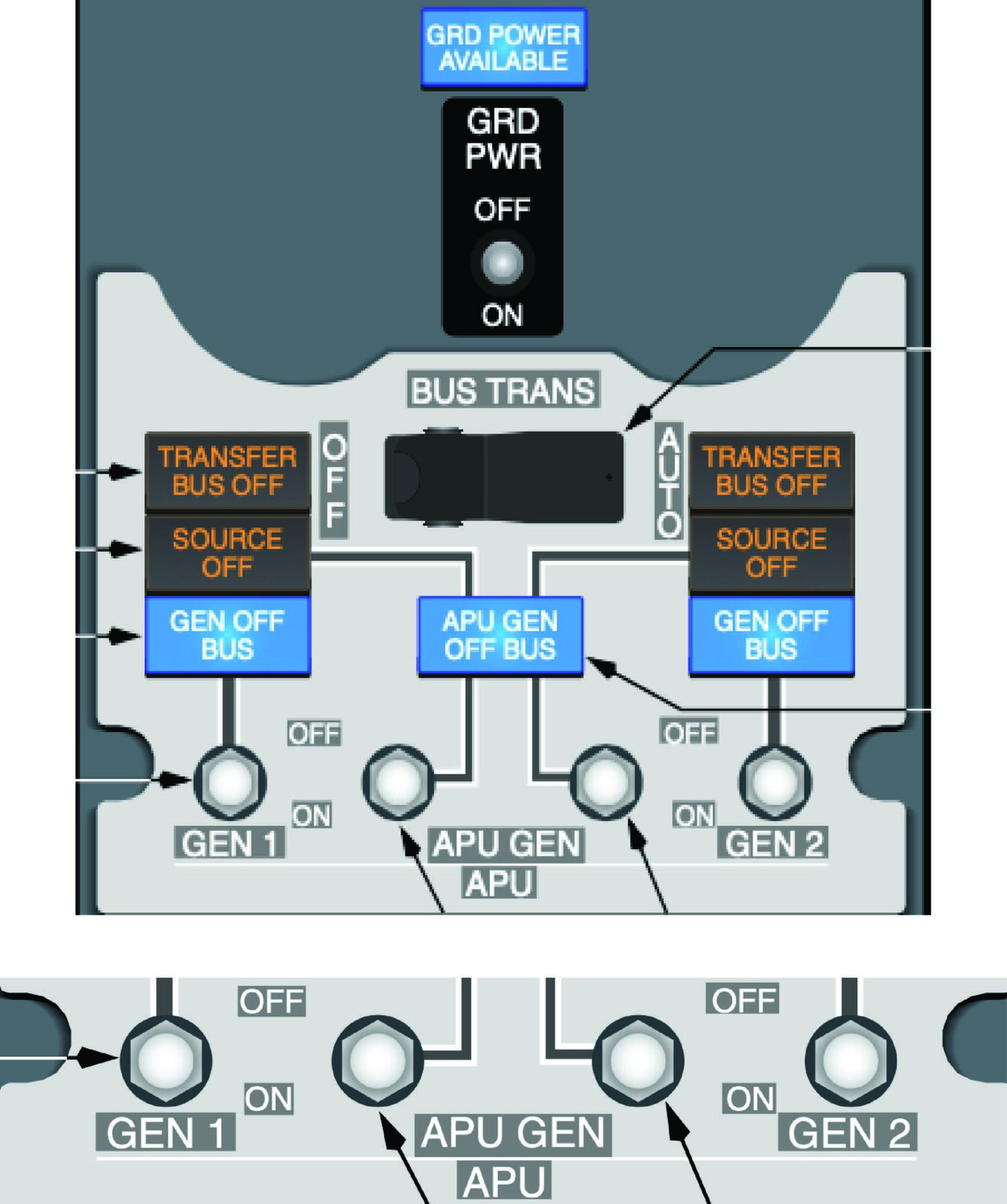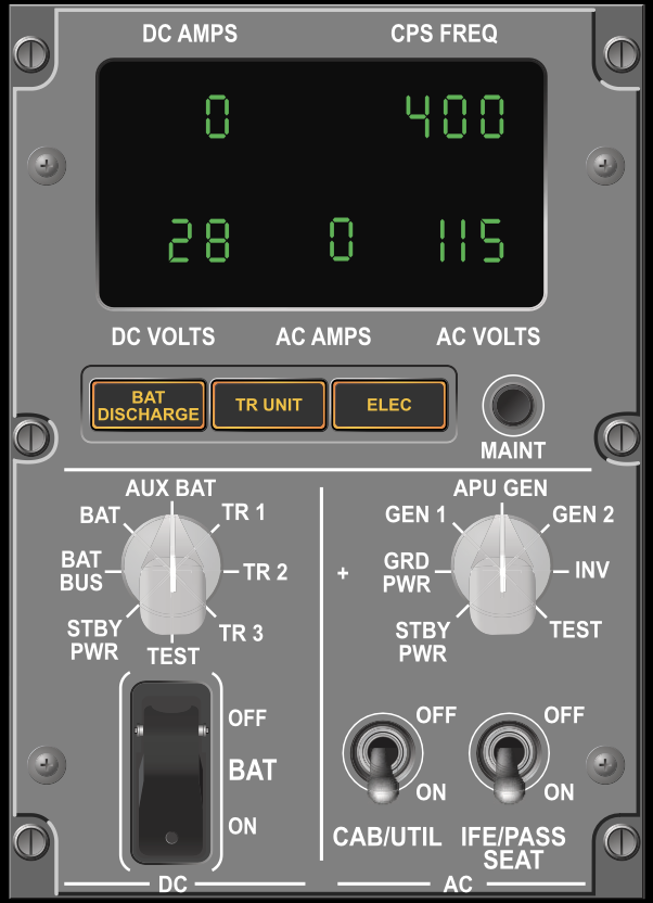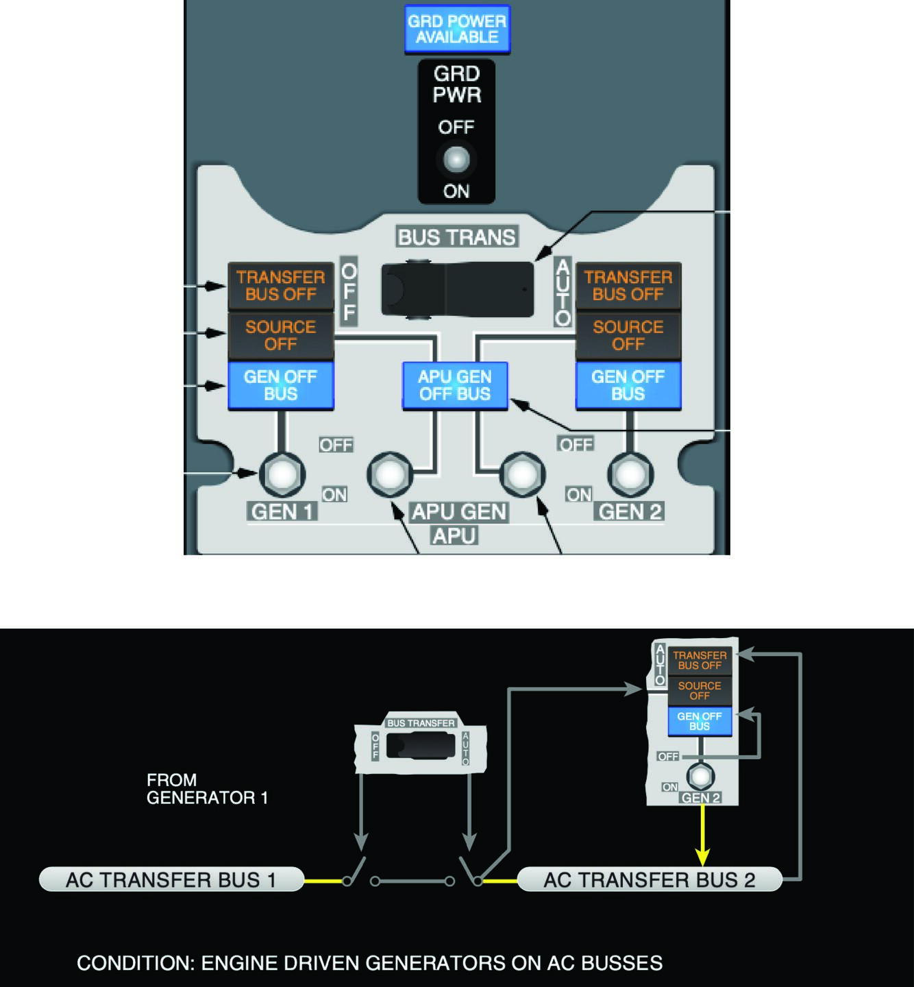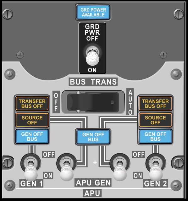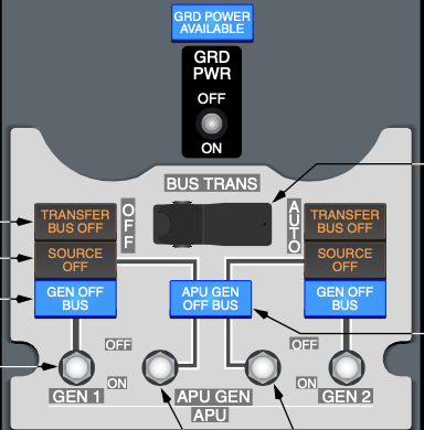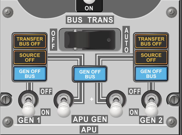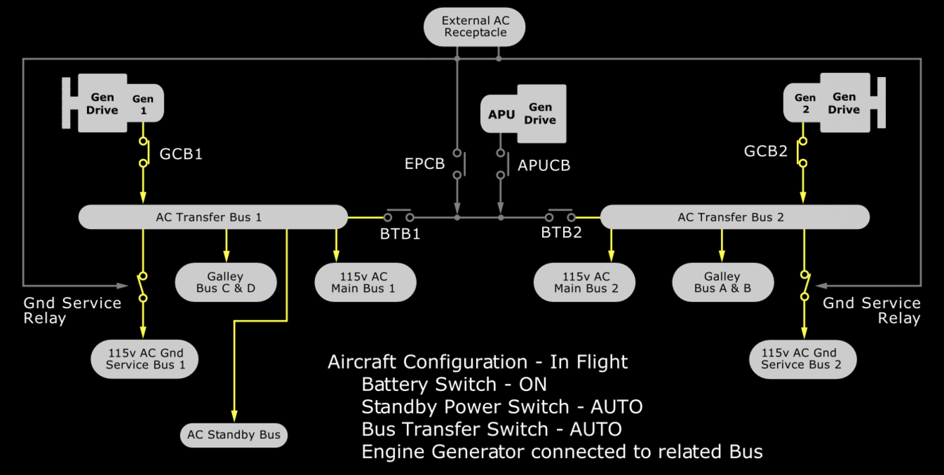 - Allows BTB’s to configure to allow AC power to AC Transfer Buses via IDG’s, APU, or External Power. DC Cross Tie also will provide isolation as required.