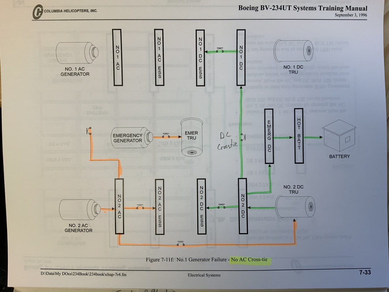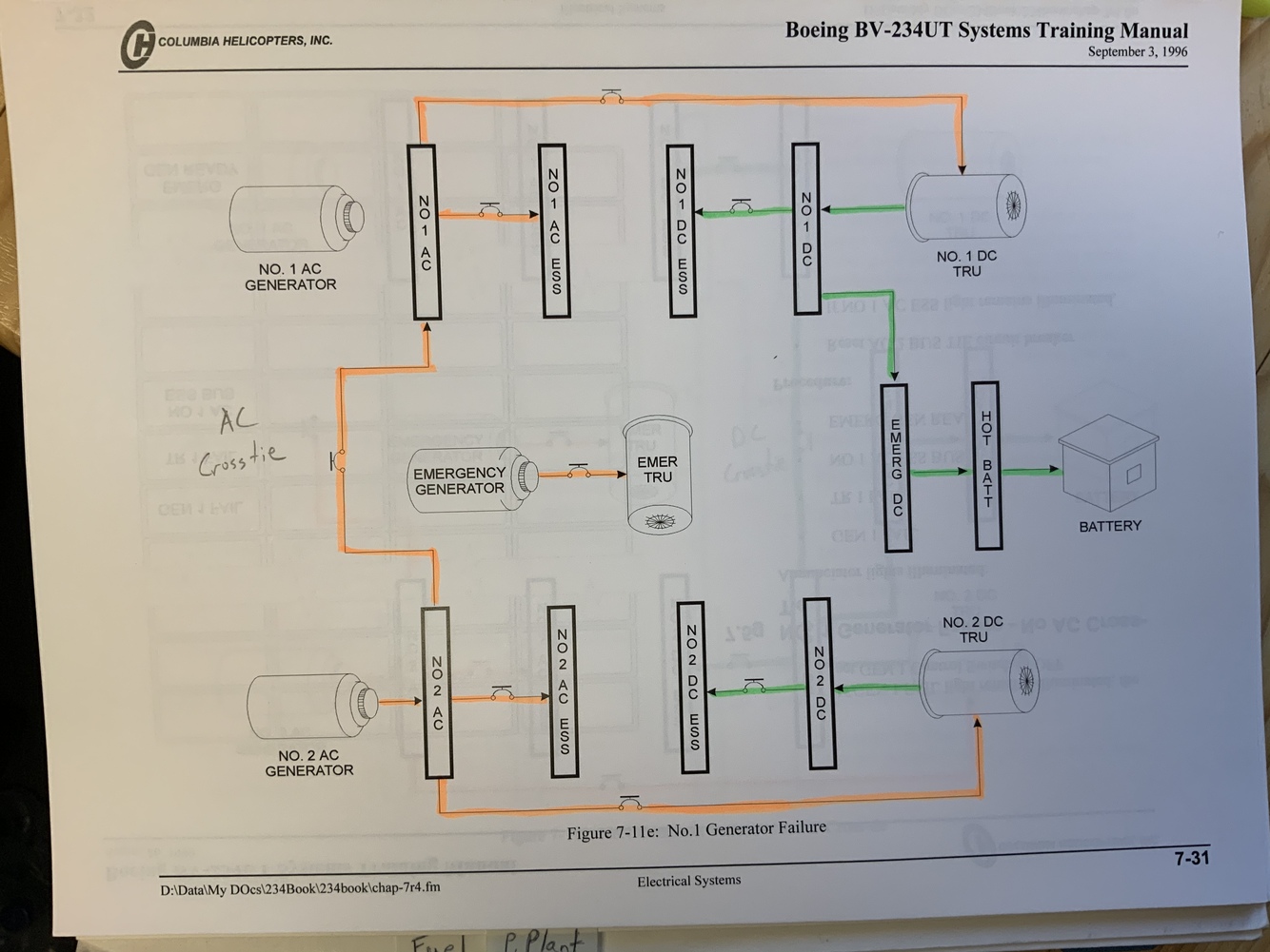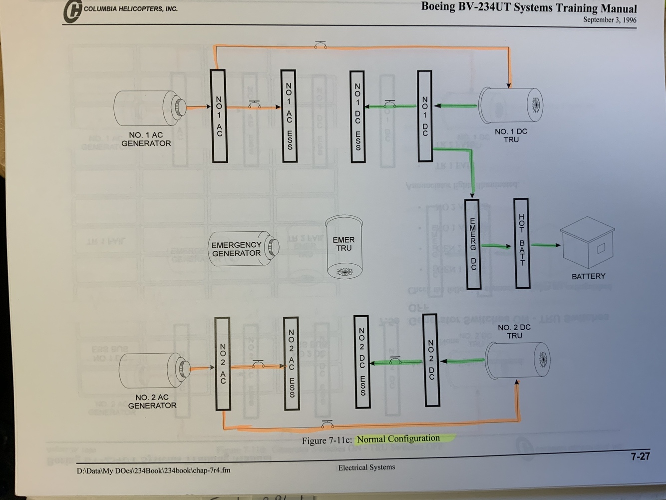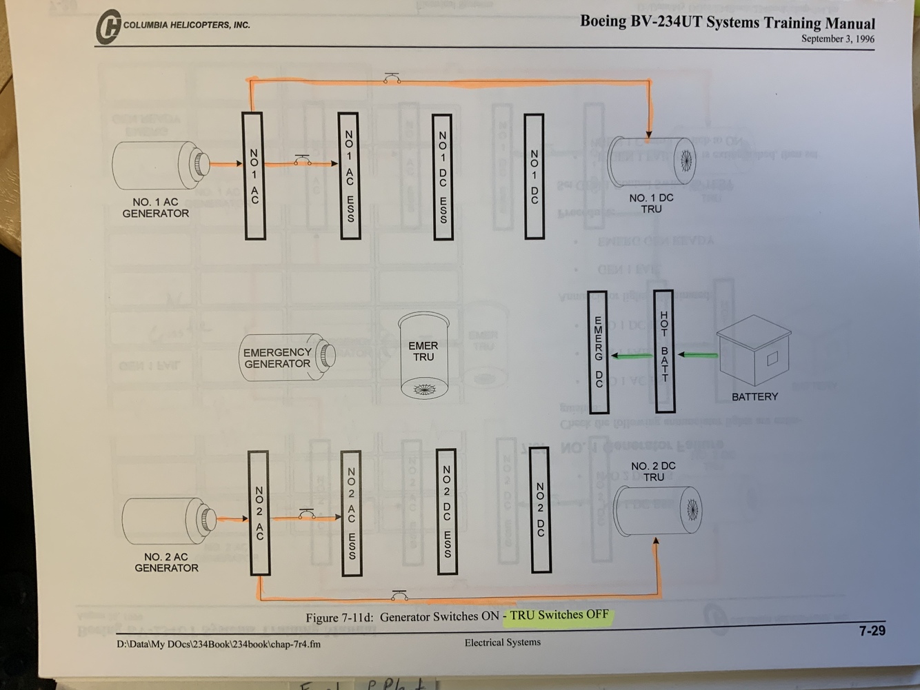 Normally powered by 2 28VDC 200 amp air cooled TRUs powered by main generators. Each TRU supplies power to its respective No. 1 and 2 primary and essential busbars. Each TRU is capable of carrying complete electrical load. When one fails a bus tie relay automatically connects the 2 DC ESS BUS bars. In the event of dual TRU failure the emergency TRU will supply power to emergency and essential DC buses 24VDC lead acid battery is housed in forward LH electrical pod and normally used to start APU