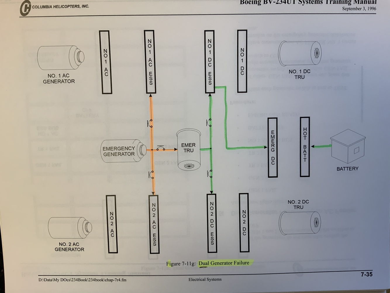 Emergency gen provides 200 volt, 400 HZ, 3 phase AC power. It is mounted on oil cooler fan gearbox and is driven by AFT TRANSMISSION Emergency GCU prevents generator from developing any power unless switch is set to TEST or FLT. A failure of a gen or TRU will cause emergency gen GCU to energize the emergency gen Emergency gen will power emergency 3 phase AC bus. Emergency TRU will provide 28VDC and illuminate EMER GEN READY light. If second main generator fails the essential bus fail relays will connect emergency AC bus to both AC ESS BUSes. If second TRU fails the DC BUS contactor will connect emergency TRU to both DC ESS BUSes