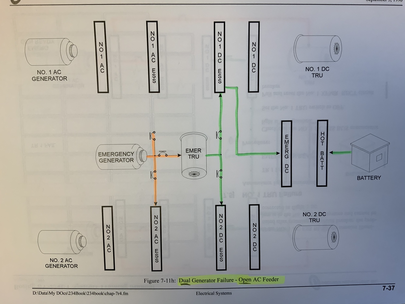 Emergency TRU will be energized when one of main TRUs fails. Upon failure of second TRU, both DC essential bus contactors are energized and output of emergency TRU is supplied to both DC essential buses Simultaneously, THE BATTERY IS DISCONNECTED