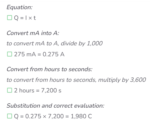 a filament lamp has a current of 275 mA flowing through it for 2 hours, calculate the charge that flows through the filament lamp