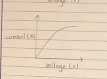 at higher voltages, the graph starts to curve over. the current increases more and more slowly as the voltage is increased. current is not proportional to voltage