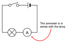 How should an ammeter be connected to measure the current in a component?
