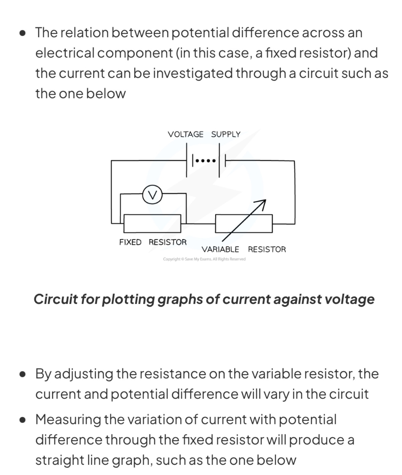 Describe how the relations between potential difference across an electrical component (in this case, a fixed resistor) and the current can be investigated through a circuit