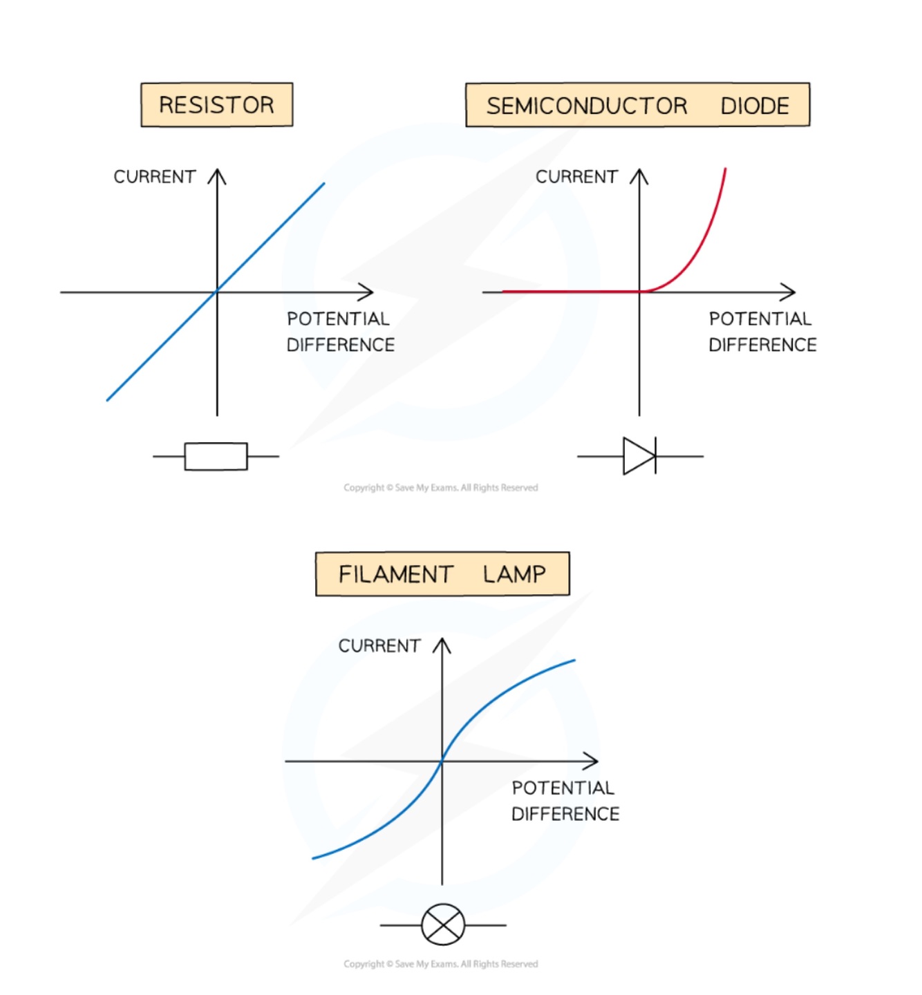 Draw the current-voltage graphs for a resistor, semiconductor diode and filament lamp