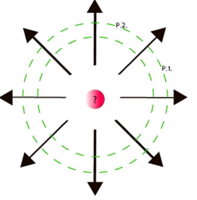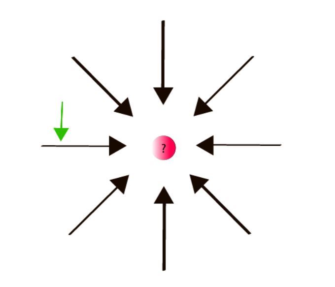 An unknown subatomic particle is dropped into the electric field around an unknown charge, at the point indicated by the green arrow.If the unknown particle moves left, what is the charge on it?