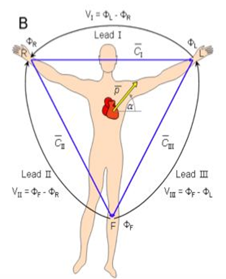 Einthoven’s triangle (Two arms and the left leg form apices of a triangle around the heart) leads to the law’s occurence