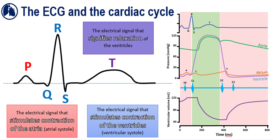 draw a normal cardic cycle on an ECG and the changes in pressure in aorta, atrium and ventricle throughout.