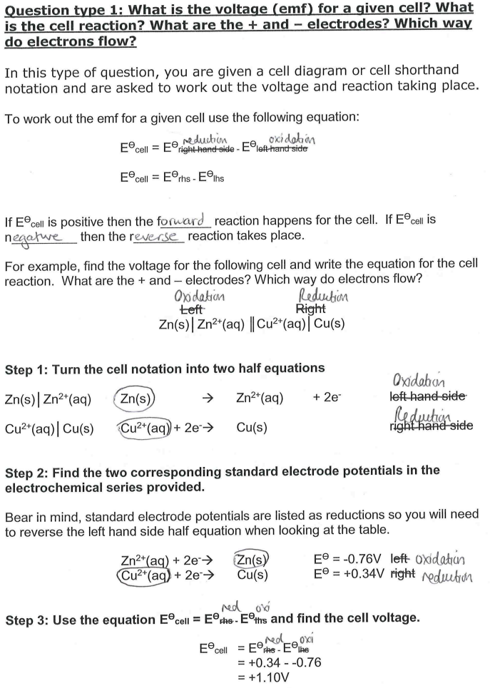 Question type 1: What is the voltage (emf) for a given cell? What is the cell reaction? What are the + and — electrodes? Which way do electrons flow?