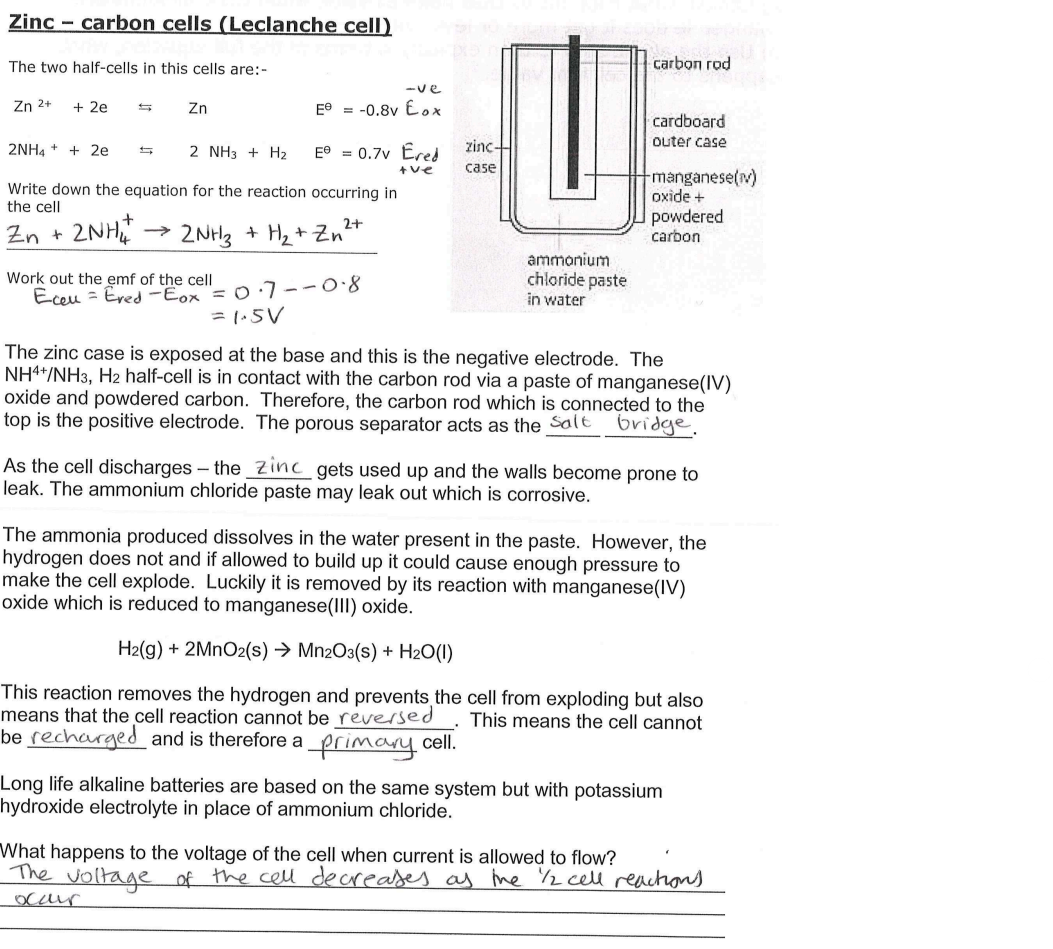 Zinc — carbon cells (Leclanche cell) - non rechargable