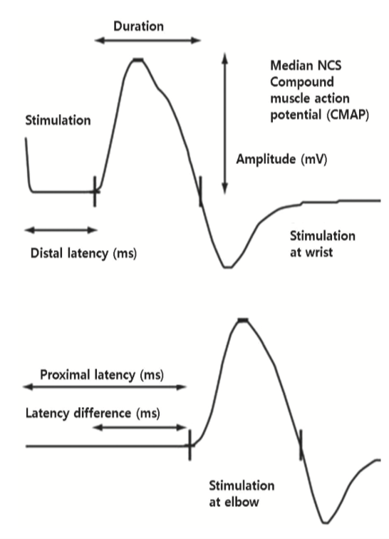 AP is sent at diff locations/segments of the N (ex: if testing ulnar N, AP is sent at levels of the elbow and armpit)