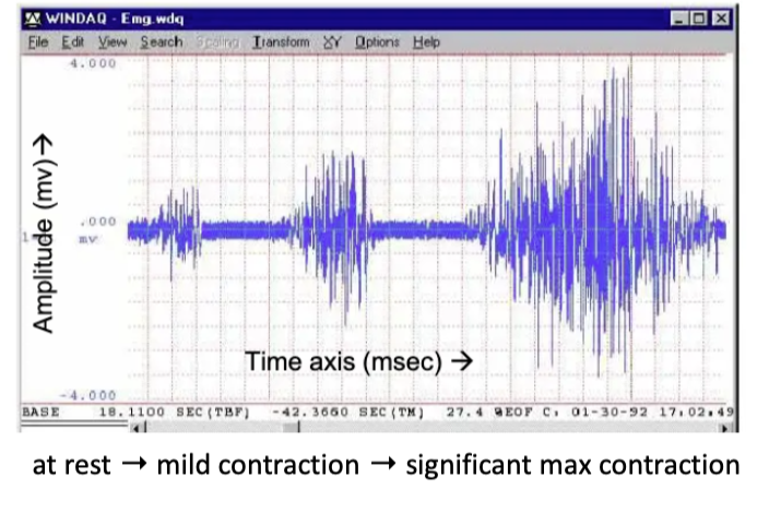 needle will pick up a certain perimeter of fibers. Some abnormalities will show a larger perimeter of fibers being assessed on EMG, hint for later