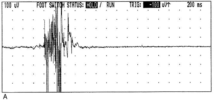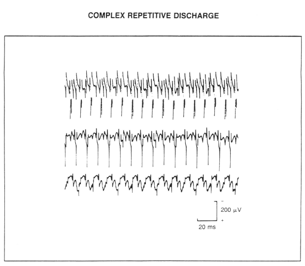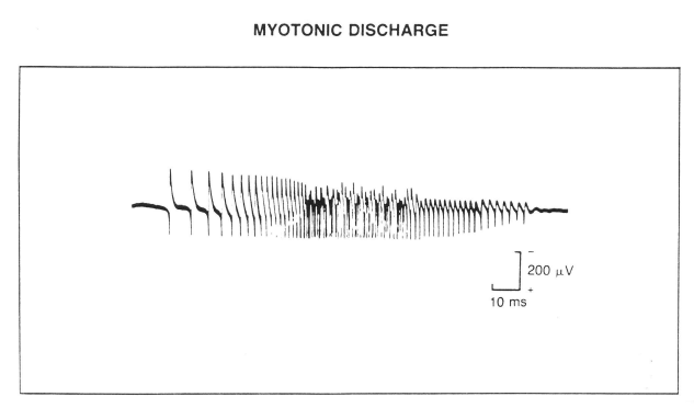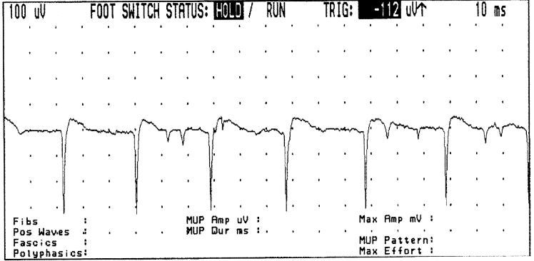 Figure: Insertional activity. Note the abrupt onset and termination of activity associated with needle placement