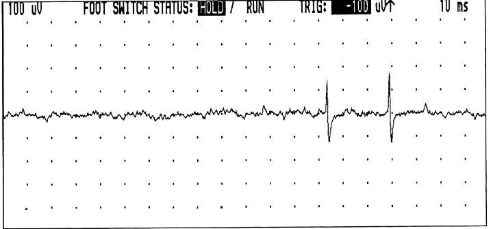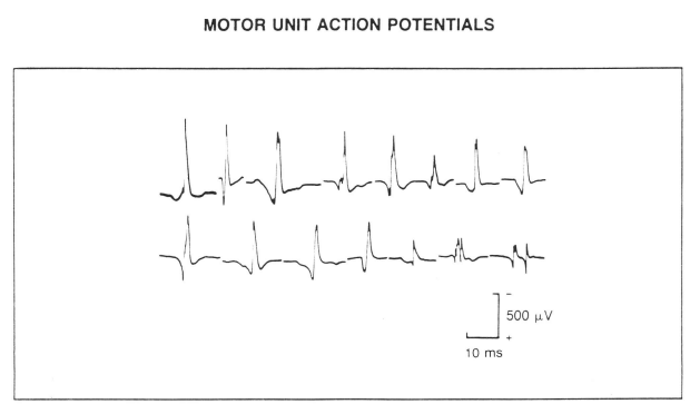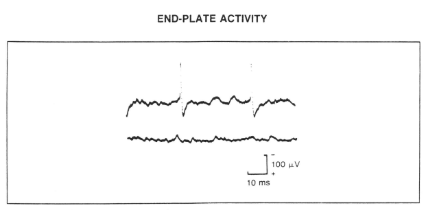 Figure: Miniature end plate potentials with 2 end plate spikes indicating close proximity of the needle to an end plate