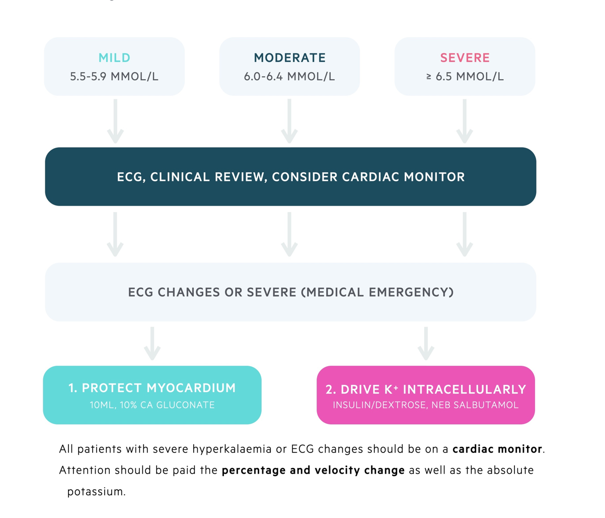 - insulin/dextrose infusion: short-term shift in potassium from ECF to ICF; (10U soluble insulin) in 25g glucose (50mL of 50% or 125ml of 20% glucose)