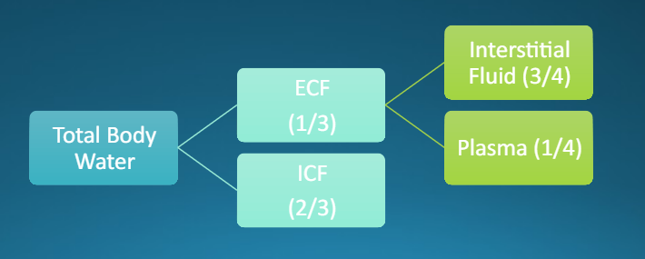 -Extracellular fluid (ECF)-> fluid surrounds all the cells in the body-> Plasma (fluid component of blood) and Interstitial fluid (surrounds all cells not in blood-> MAINTENANCE IS CRITICAL TO TISSUE PERFUSION