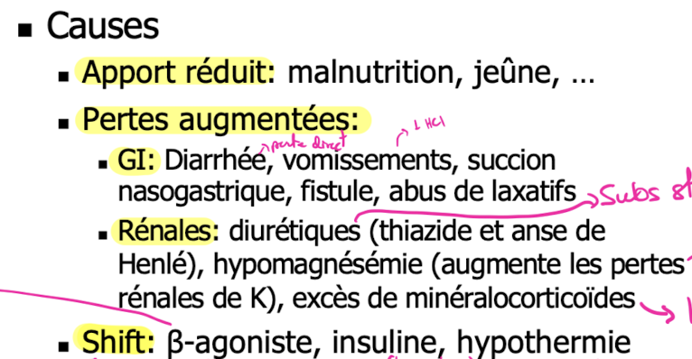 Quels sont les causes d’hypokaliémie?
