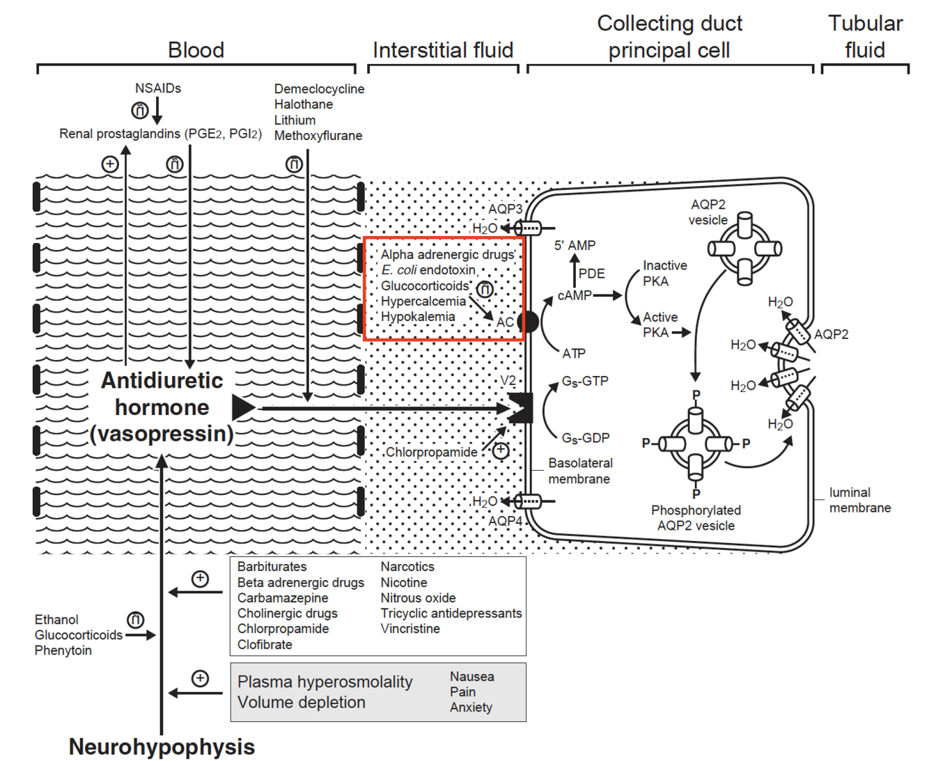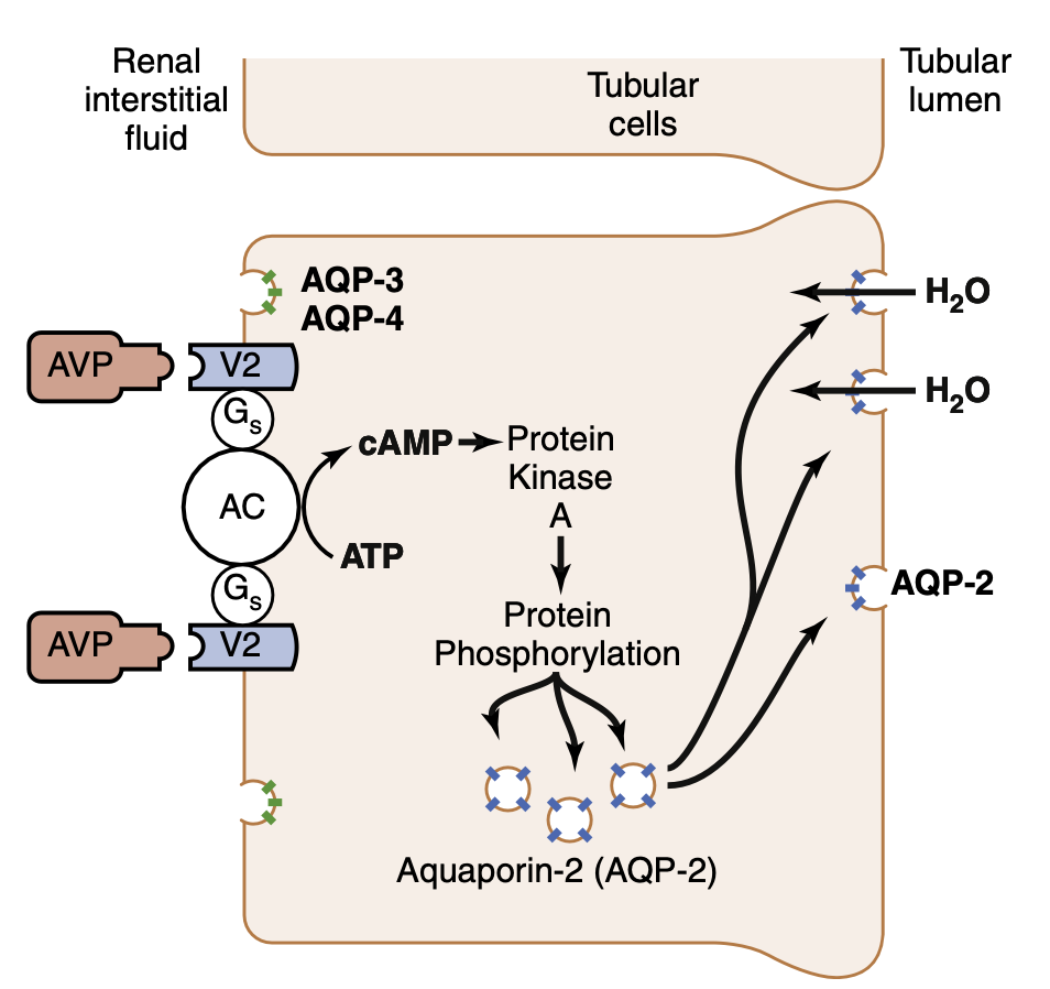 ADH binds to V2 receptors, which are coupled with stimulatory G proteins (Gs) → activates adenylate cyclase (AC) → stimulates formation of cyclic adenosine monophosphate (cAMP) from ATP → activates protein kinase A and phosphorylation of intracellular proteins → moving aquaporin-2 (AQP-2) to the luminal side of the cell membrane.