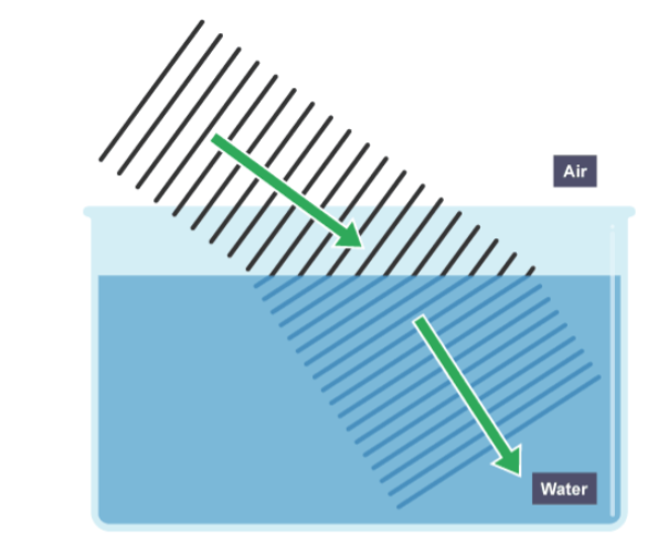 In this diagram, light waves move from air into water. Light waves move slower in water. The right hand side (the bottom edge) of the incoming wave slows down before the left hand side does. This causes the wave to change direction.