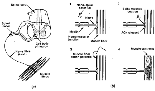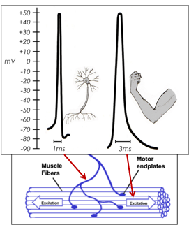 Draw what a neurons signal to a muscle fiber looks like early and late in transit