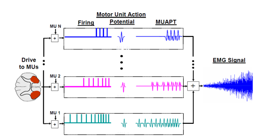 Summation of all triphasic bursts. Rate coding (firing rates) and addition of motor units to grade the amount of force needed. Can quickly change these forces, likes to pulse, hard to maintain one level.