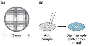 True or False: EM sections are mounted on copper grids and stained with heavy metals to obtain a micrograph.