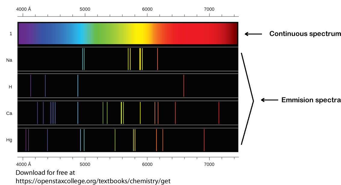 Discrete lines at designated wavelengths (in the UV, visible and IR) which result from electrons “falling” from higher to lower energy levels. Each element will have its own emission spectrum, which a reflection of the energy difference between excited states and ground state.
