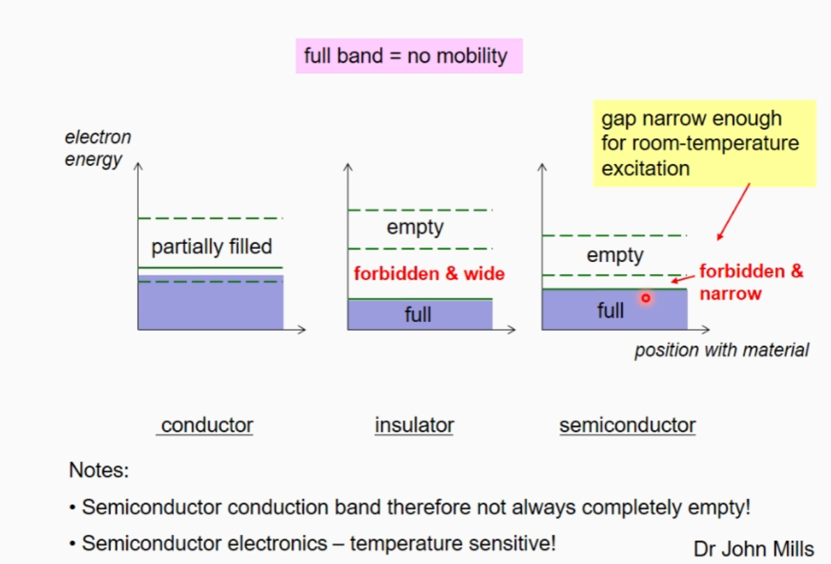 Describe the electron bands for a conductor, insulator and semiconductor and any key information.