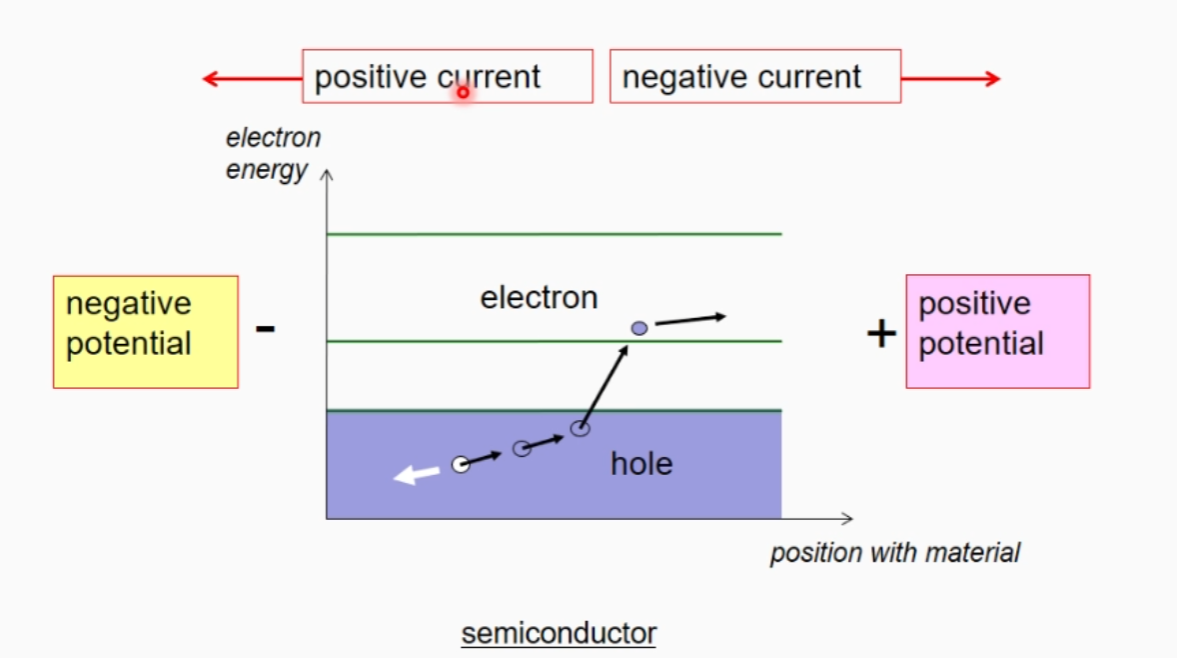 When an electric field is provided across a semiconductor, and some electrons may be excited at room temperature, those electrons flow from the negative to the postive potential, leaving holes. Holes then get filled by more electrons, so seemingly the holes flow to the negative while electrons to the positive. Current is always from positive to negative, so positive current is the direction of the holes.