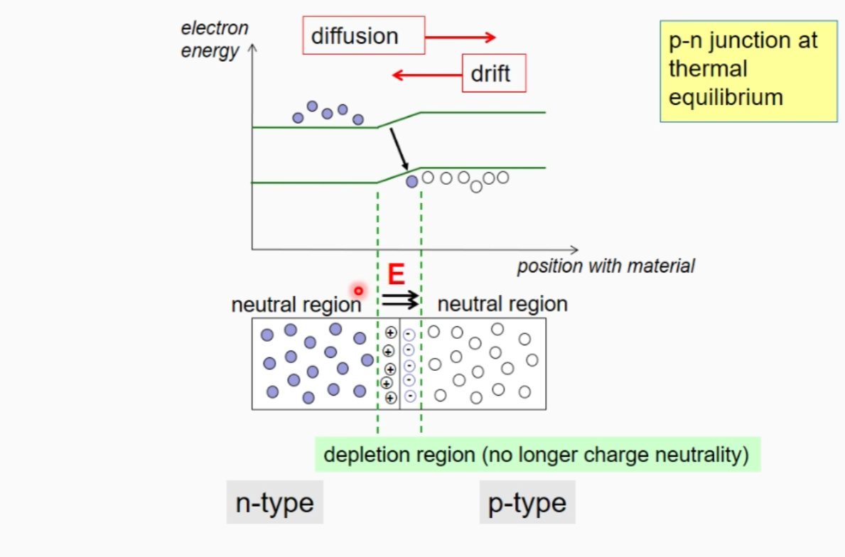 There is also some drift caused by the recombination effect, resulting in the minority charge carriers respectively in each semiconductor being pushed into the other side so the two semiconductors balance.