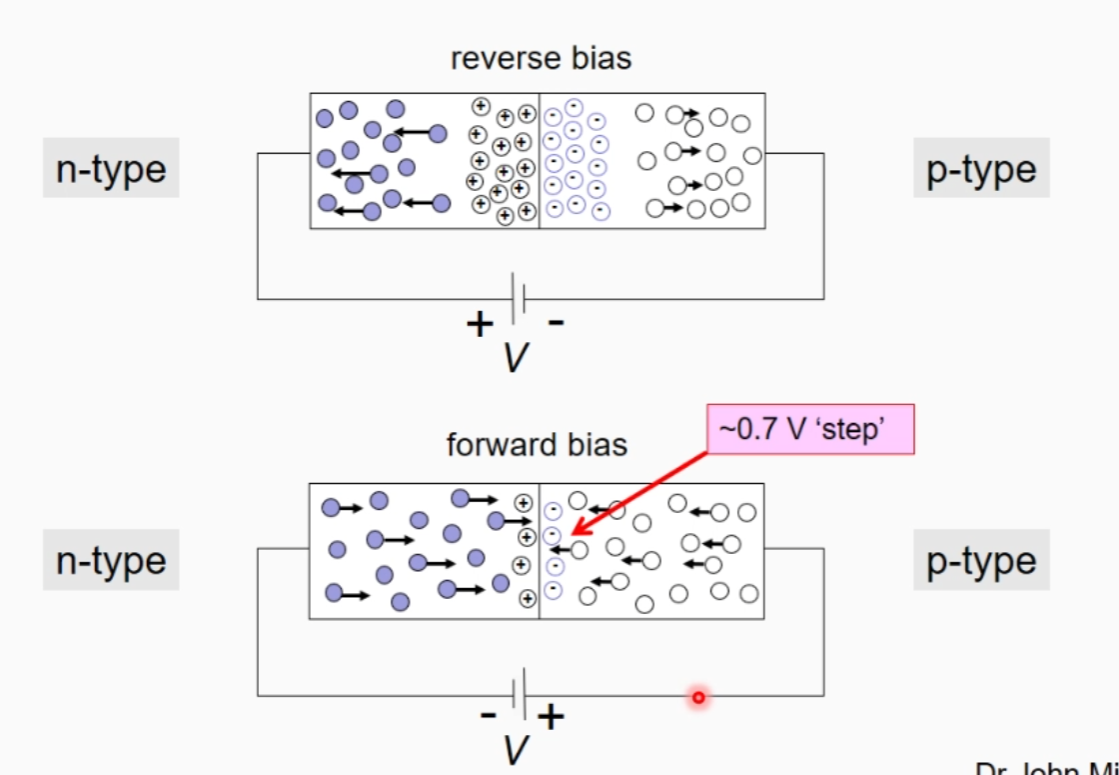 * Decreases the depletion region, making it easier for current to flow when a potential difference is provided greater then the electronic field p.d. generated (usually 0.7v).