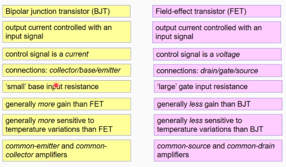 Compare a Bipolar Junction transistor (BJT) to a Feild-Effect transistor (FET)