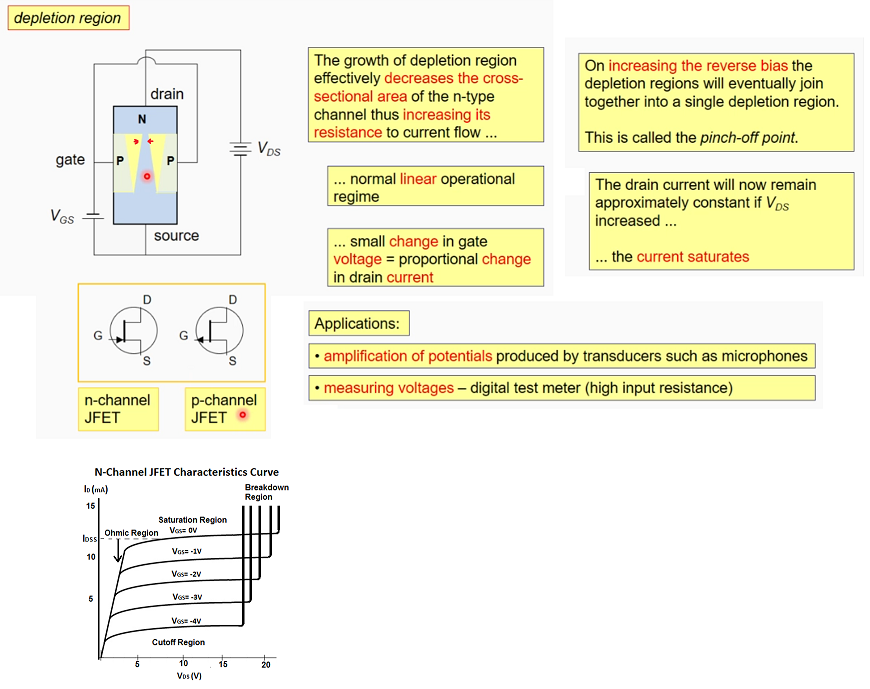 * Usually JFETs are operated in depletion-mode, where they conduct current (are always on) with zero volts across the gate, unless volts supplied to gate.