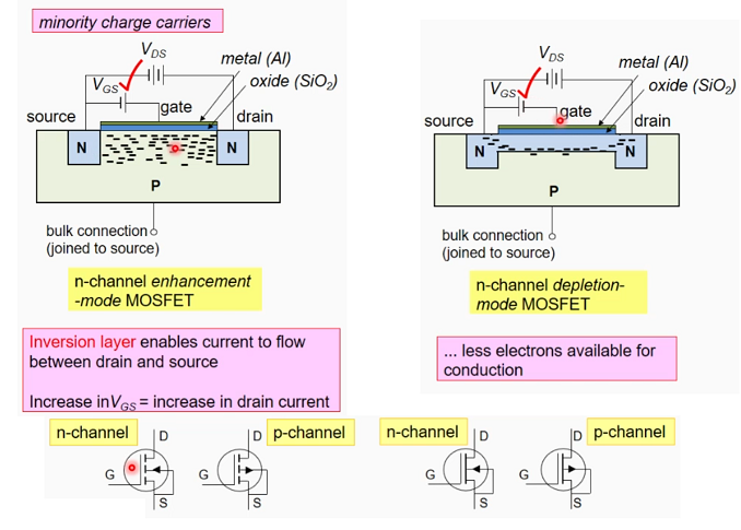 * By supplying a sufficient Vgate, minority carriers (electrons) in the p semiconductor are drawn close to it (due to electric field) to create a ‘bridge’ almost (inverstion layer) that enables current to flow between the drain and source, between the two n semiconductors.